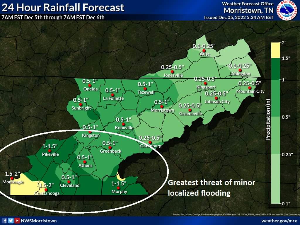 Rain will spread across the area today and tonight, and some of the rain may be moderate to heavy at times. Localized flooding will be possible, mainly across the southern and central portions of east Tennessee. Rainfall totals today are expected to be between a quarter and half an inch.