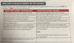 He stated there are options for 3rd graders and they can retake the ELA TCAP if they do not pass. If scoring below passing or ‘approaching’ your child will not be retained, as long as they meet requirements. Those requirements include: the child having a disability that impacts reading, a child who is learning English and received less than two years of English instruction, and 90% attendance in summer programming. A full list of requirements can be found below: