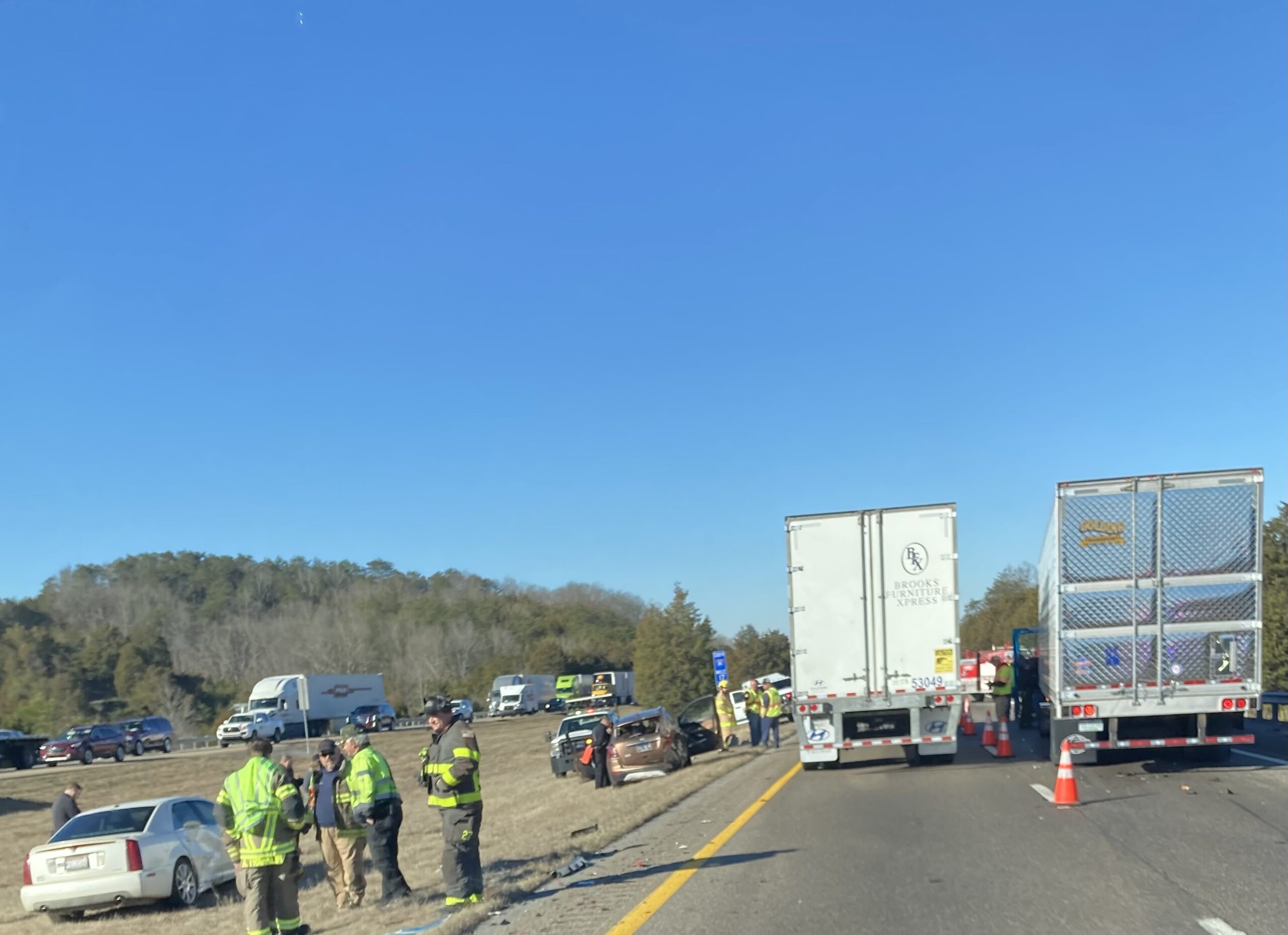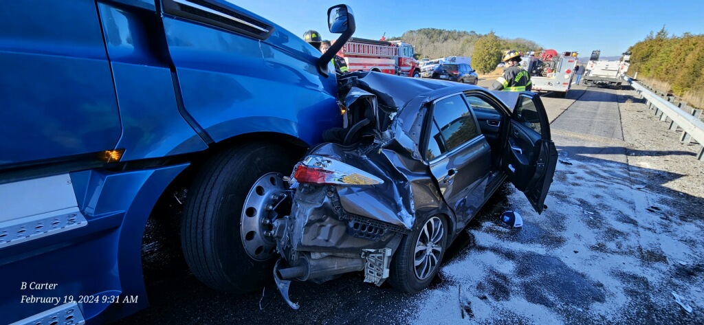 The first accident happened before 7:30 AM when a tractor trailer travelling northbound at mile marker 15 crossed into the median and into oncoming traffic in the southbound lane. The semi struck a car driven by Jeffery Jones in the front. Both the semi and Jones’ vehicle came to rest off the roadway. A guardrail was torn loose in that accident and was laying across all southbound lanes when it was struck by a car driven by Briana Bailey. A fourth car, driven by a Virginia man, struck the guardrail and Bailey’s car in the rear. Only Jones, the driver of the car struck by the semi, was injured.