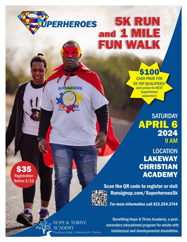 The event is scheduled for Saturday, April 6th at Lakeway Christian Academy in White Pine at 9 AM and benefits Hope & Thrive Academy, their post-secondary educational program for adults with intellectual and developmental disabilities. Registration will begin at 8 AM, the 5K will kick-off at 9, followed by the 1 Mile Fun Walk shortly after.