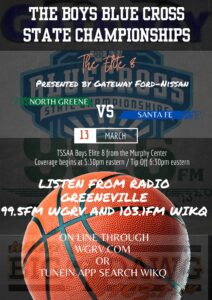 Radio Greeneville will provide coverage of North Greene’s quest for the school’s first State Championship.  North Greene plays Santa Fe on Wednesday from the Murphy Center at Middle Tennessee State University.  Coverage of the Elite 8 match up begins at 5:15pm eastern with the Tournament Tip Off show and Tip Off is set for 6:30pm eastern.  Listen from 99.5FM WGRV and 103.1FM WIKQ or stream through WGRV.com and search Tune In: WIKQ.