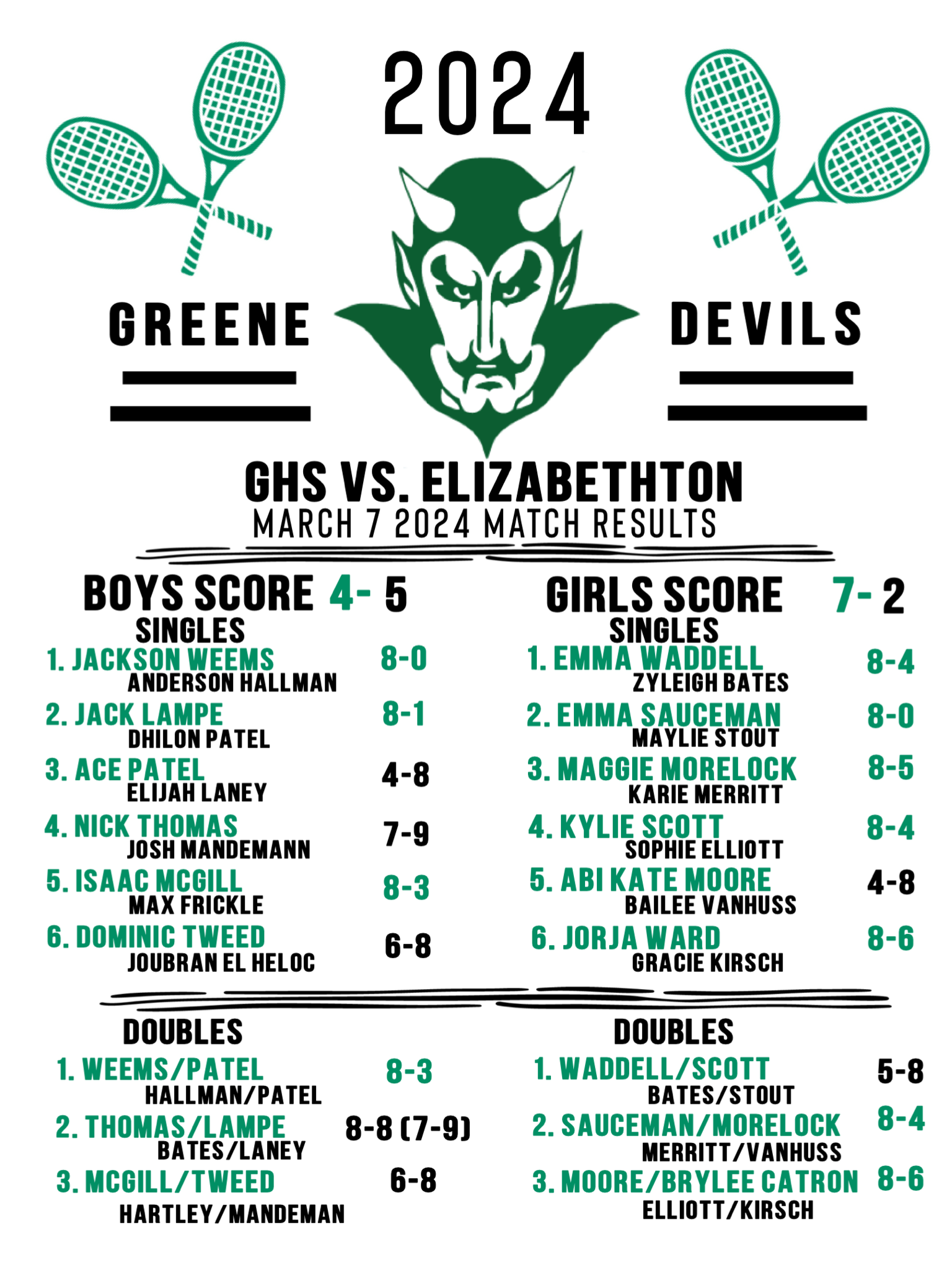 Home matches begin at 4:00 PM at the Greene County Tennis Center at 1209 Hal Henard Road.