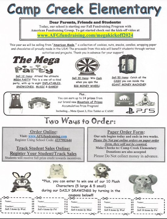 Camp Creek Elementary School is having a fundraiser through September 4th, 2024. The fundraiser will help the school raise money to update and replace their playground equipment.