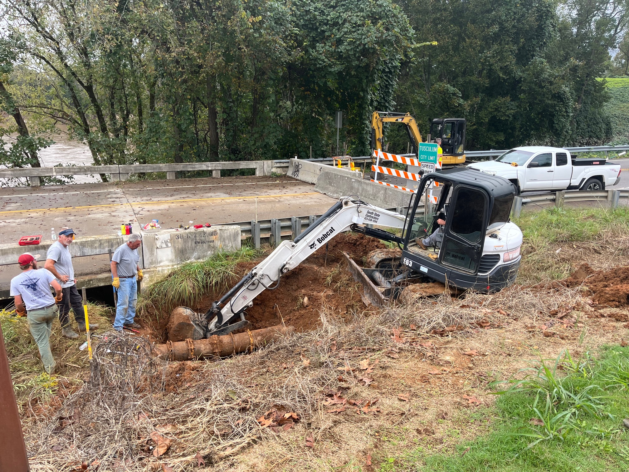 Work continues on boring underneath the river at Earnest Bridge and installing a temporary line across the river where Kinser Bridge was washed away on the Erwin Highway. That line feeds the Horse Creek and Middle Creek areas and continues all the way to South Central School