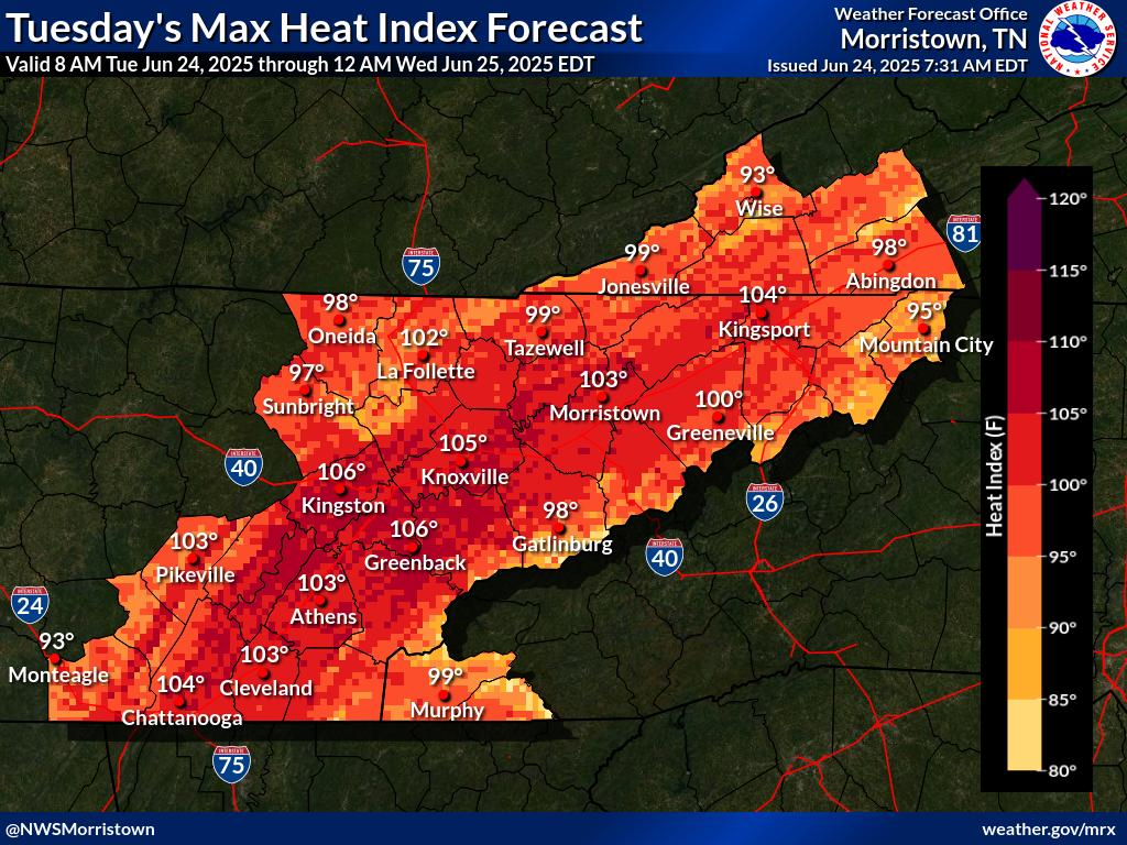 The National Weather Service in Morristown has issued a HEAT ADVISORY from 1 pm today until 7 pm on Wednesday. This advisory includes most of Greene County and should be taken seriously.