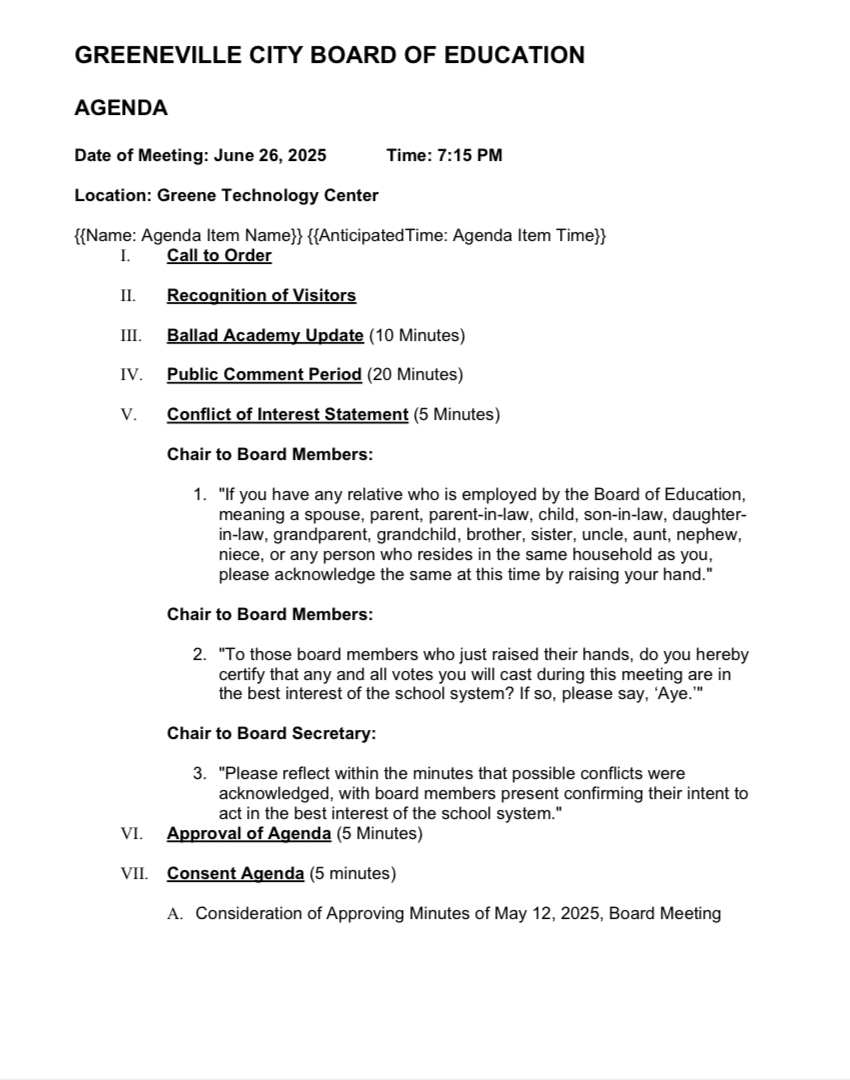 The Greeneville City Board of Education will meet at 7:15 pm after the Joint Board meeting. Budgetary matters including the 25–26-year budget, a differentiated pay plan, consideration of lacrosse, a Ballad Academy update and moving plans from George Clem to the Hal Henard are among items on that agenda released earlier today.