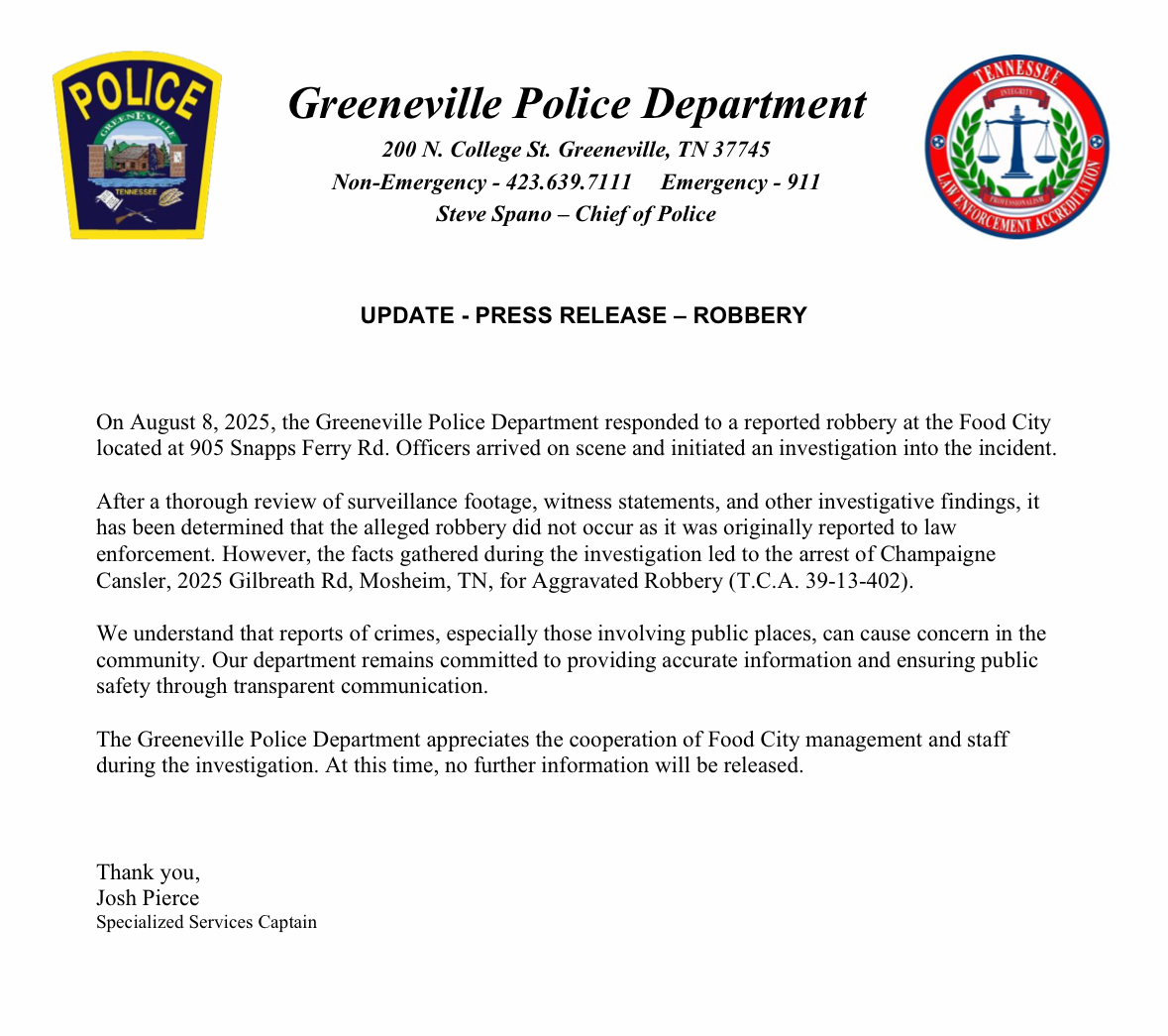 A release this morning from Greeneville Police Department Specialized Services Captain Josh Pierce says “after a thorough review of surveillance footage, witness statements and other investigative findings, it has been determined the alleged robbery did not occur as it was originally reported to law enforcement.   However, the facts gathered during the investigation led to the arrest of 34 year old Champagne Cansler, 2025 Gilbreath Road, Mosheim for Aggravated Robbery.”