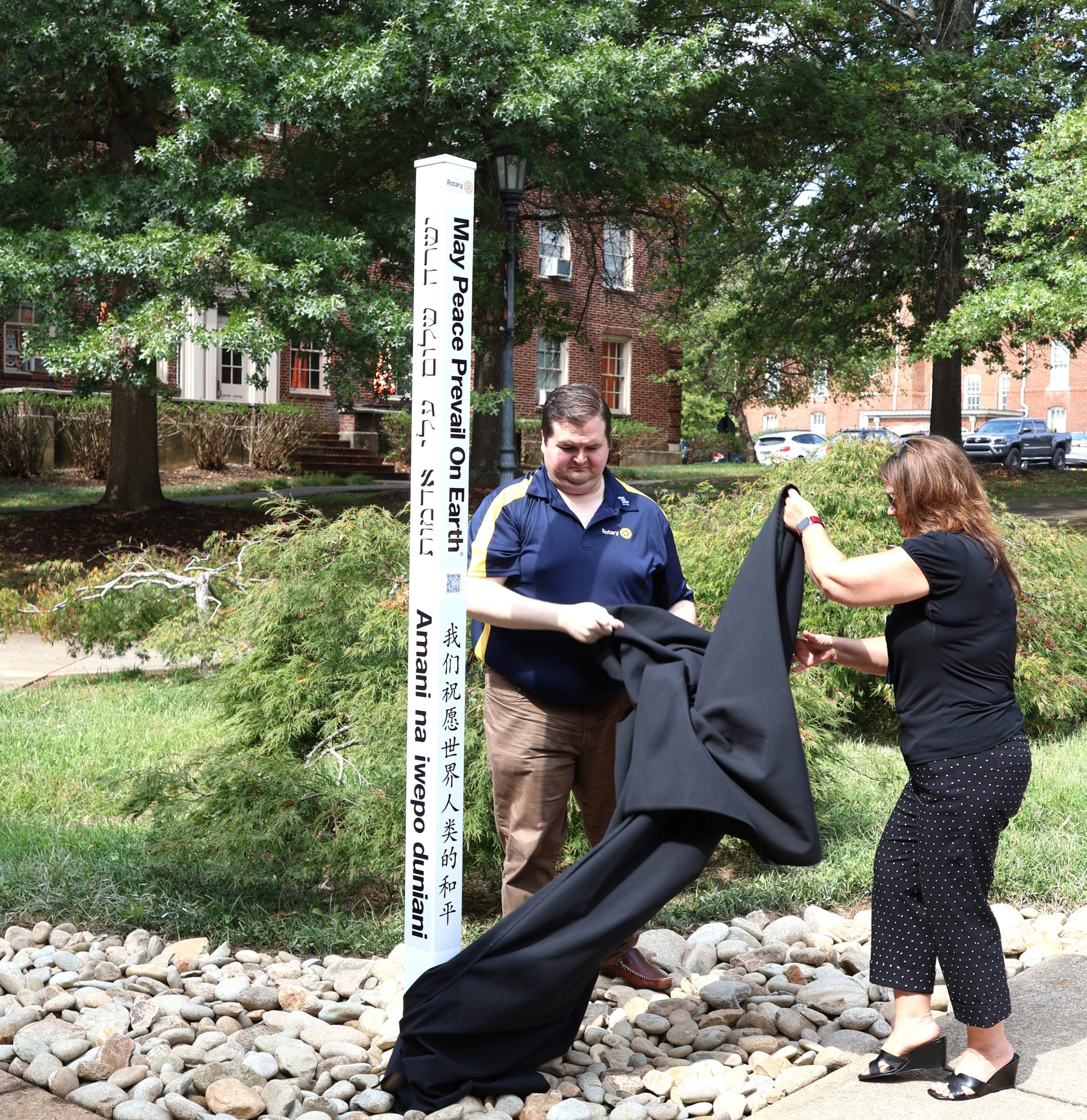 The Rotary Club of Greeneville organized the placement of a peace pole at the commons, which the current club president, Brandon Farmer, and past president, Lucia Fillers, uncovered during the event Tuesday, Sept. 23. The pole, a project of Rotary International, contains the message “May Peace Prevail on Earth” in eight languages – English, Spanish, Mandarin, Swahili, Bengali, Ukrainian, Arabic and Hebrew.