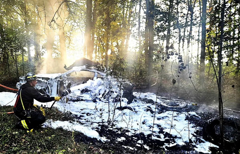 This was the scene when firefighters first arrived. (PHOTO FROM TUSCULUM VOLUNTEER FIRE DEPARTMENT)Investigation revealed the 2000 Ford Mustang belonged to Robert Duncan of Chestnut Ridge Road in Afton, about a half mile from the fire scene.  Those living at the Chestnut Ridge Road residence reported hearing noise outside around 5:30 and again at 6:30 am.