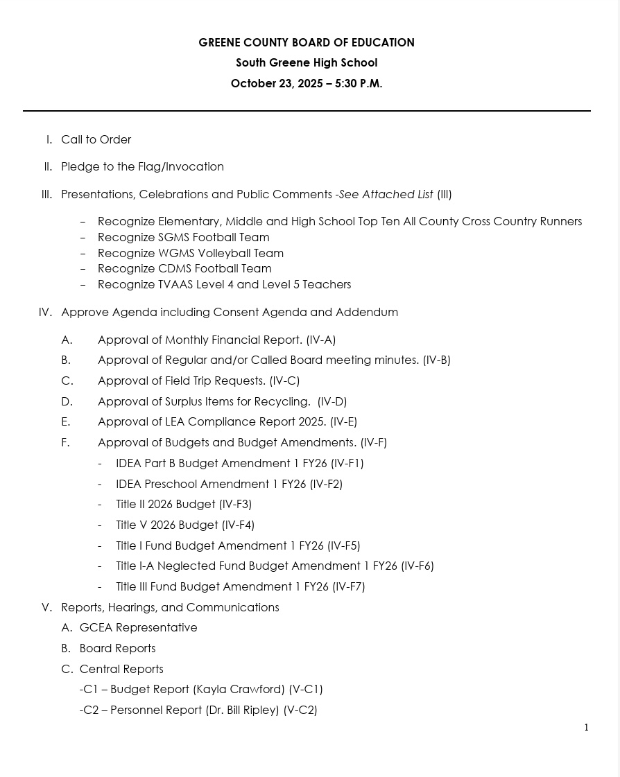 Several academic and athletic recognitions are also scheduled during the 5:30 pm meeting at South Greene High School.