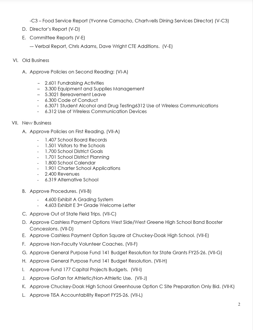 Agenda items include an update on the CTE constructions at West Greene and Chuckey Doak.