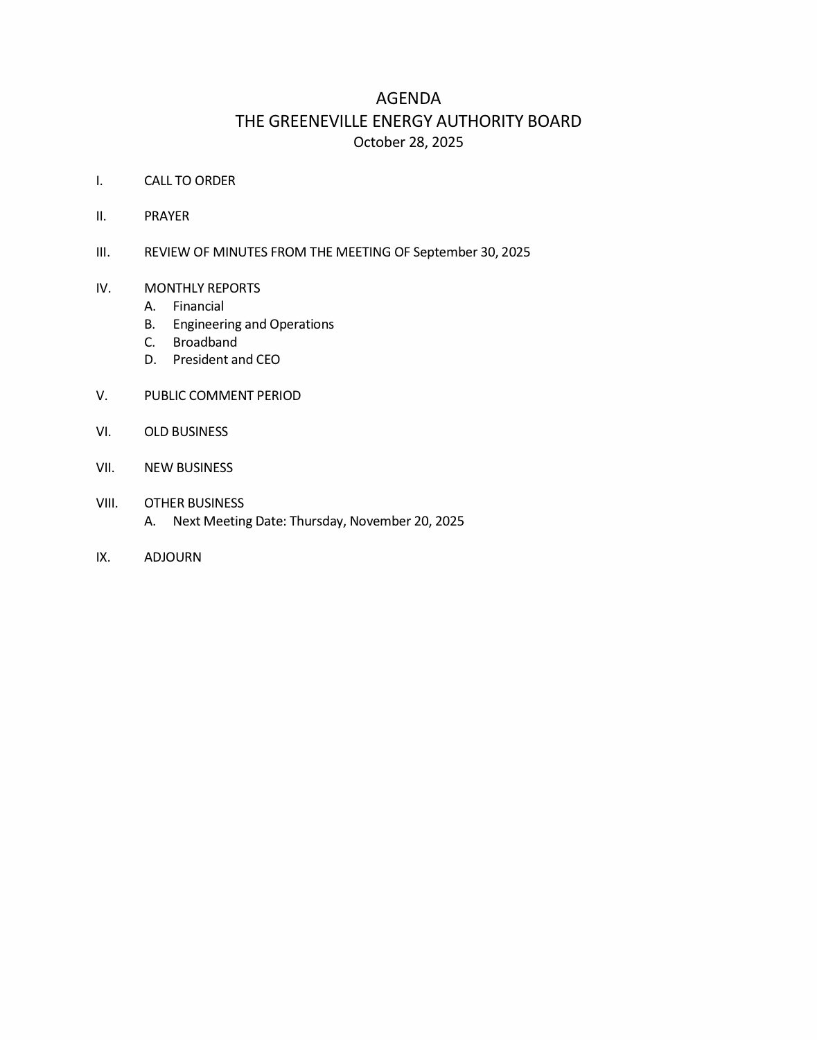 The Greeneville Energy Authority October meeting will be Tuesday at 9 am in the GEA building. Below is the agenda.