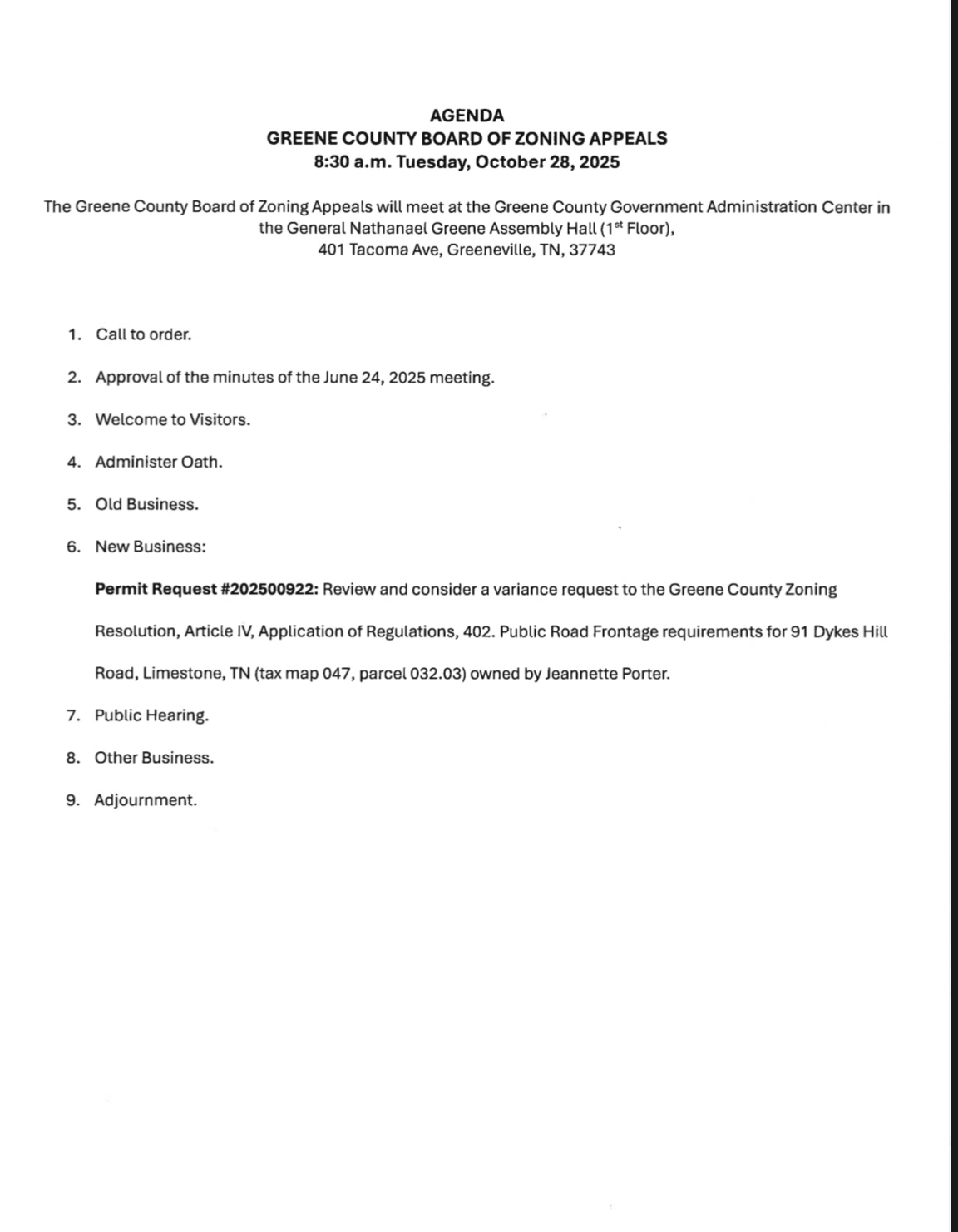 The Greene County Board of Zoning Appeals will meet at 8:30 Tuesday morning at the Greene County Administration Center.
