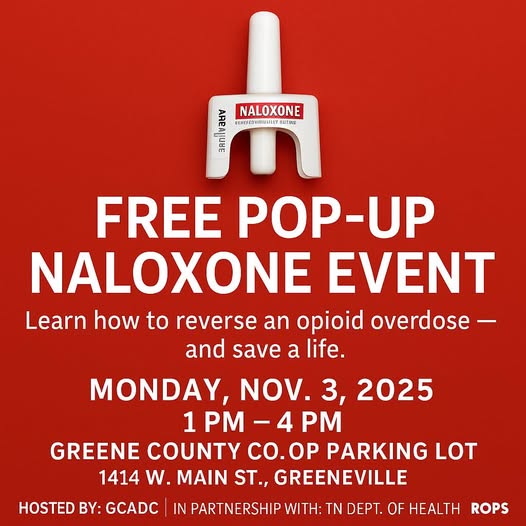 Greeneville, TN — The Greene County Anti-Drug Coalition (GCADC) is partnering with Adam Clark, Northeast HIA Coordinator with the Tennessee Department of Health, and Matthew Crawford, CPRS, Regional Overdose Prevention Specialist (ROPS) with the Sullivan County Anti-Drug Coalition, along with Insight Alliance–Lifeline and REST programs, to host a Pop-Up Naloxone Distribution Event on Monday, November 3, 2025, from 1 p.m. to 4 p.m. in the Greene County Co-Op parking lot, located at 1414 W. Main Street, Greeneville.