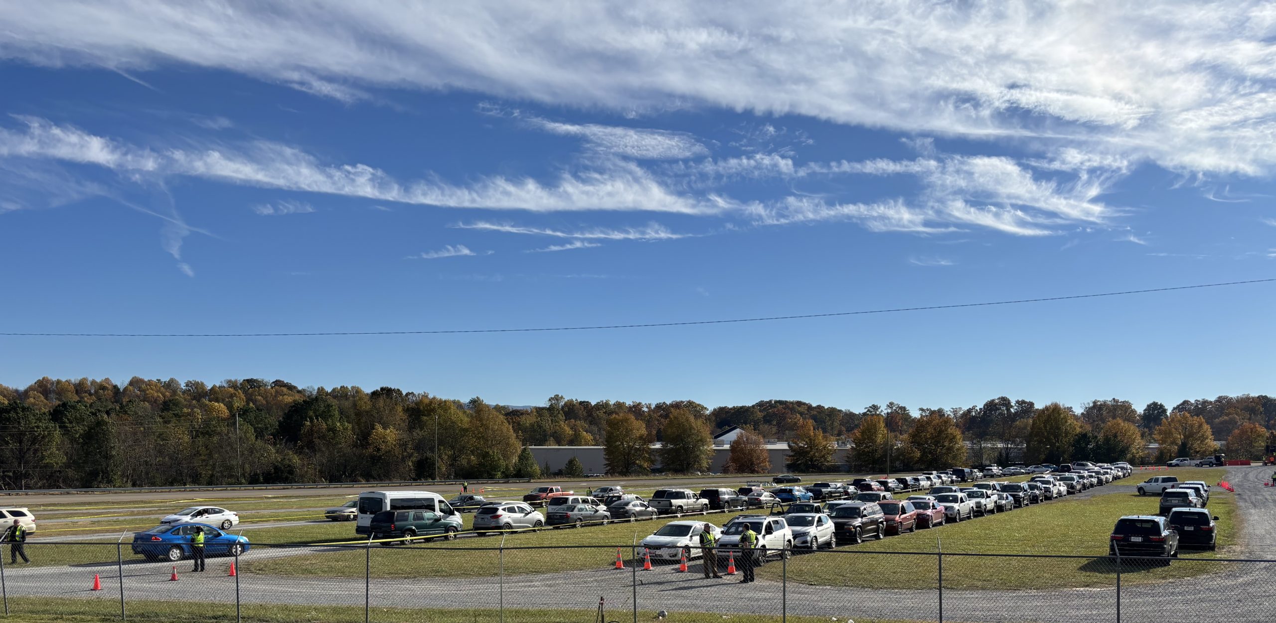 Vehicles had been lining up since early afternoon in front of the fairgrounds in anticipation of the food distribution. Shown below prior to the official start were the first of hundreds of vehicles which showed up on Wednesday. Greeneville Police organized the traffic flow plan.