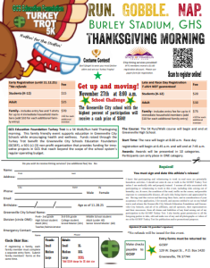 The 11th Annual Greeneville City Schools Education Foundation Turkey Trot will take place on Thanksgiving morning, November 27, 2025, at 8:00 AM. The USATF-certified 5K welcomes runners and walkers of all ages, features multiple award divisions, a costume contest, and supports GCS through fundraising for teacher grants and school participation prizes. Online registration is available through the GCS Education Foundation.