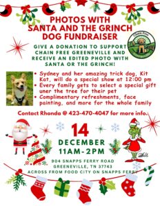 There will be a Santa and The Grinch dog fundraiser on December 14, 2024, from 11:00 AM to 2:00 PM at 904 Snapps Ferry Road in Greeneville. There will be special shows with trick dogs, refreshments, face paintings, and more. Every family will be able to select a special gift under the tree for their pet. Donations support Chain Free Greeneville. In return for donations edited photos with Santa or the Grinch will be offered.